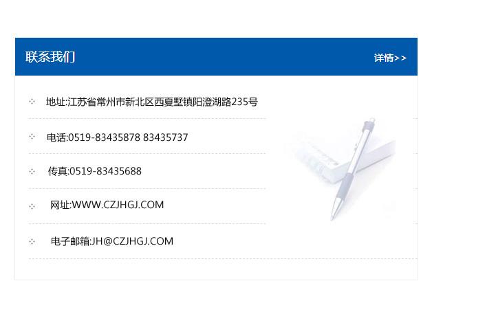 地址:常州市新北區友邦商務大廈1幢16、17層  電話:0519-85101652  傳真:0519-85112595  郵編:213022  網址:www.cz-jiayue_cn.jsgnlt.com  郵箱:xiajifengaa@163.com